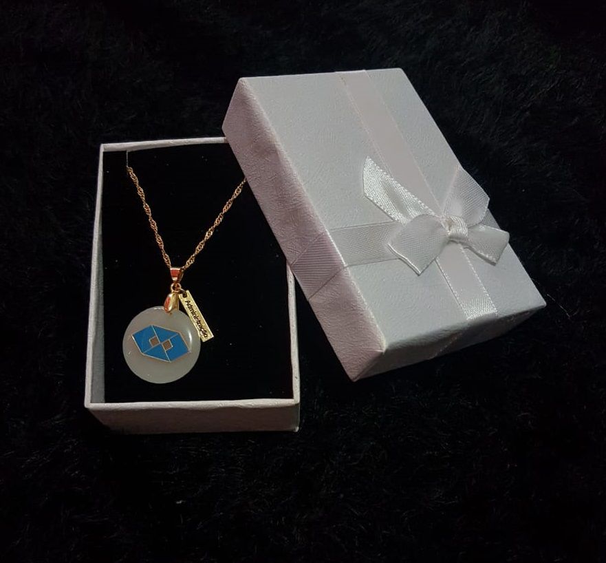 Uma semi jóia maravilhosa ! Folheado a ouro com banho de 10 milésimos, pingente acrilico, cor perolada com placa de folheado a ouro e simbolo de administração azul.