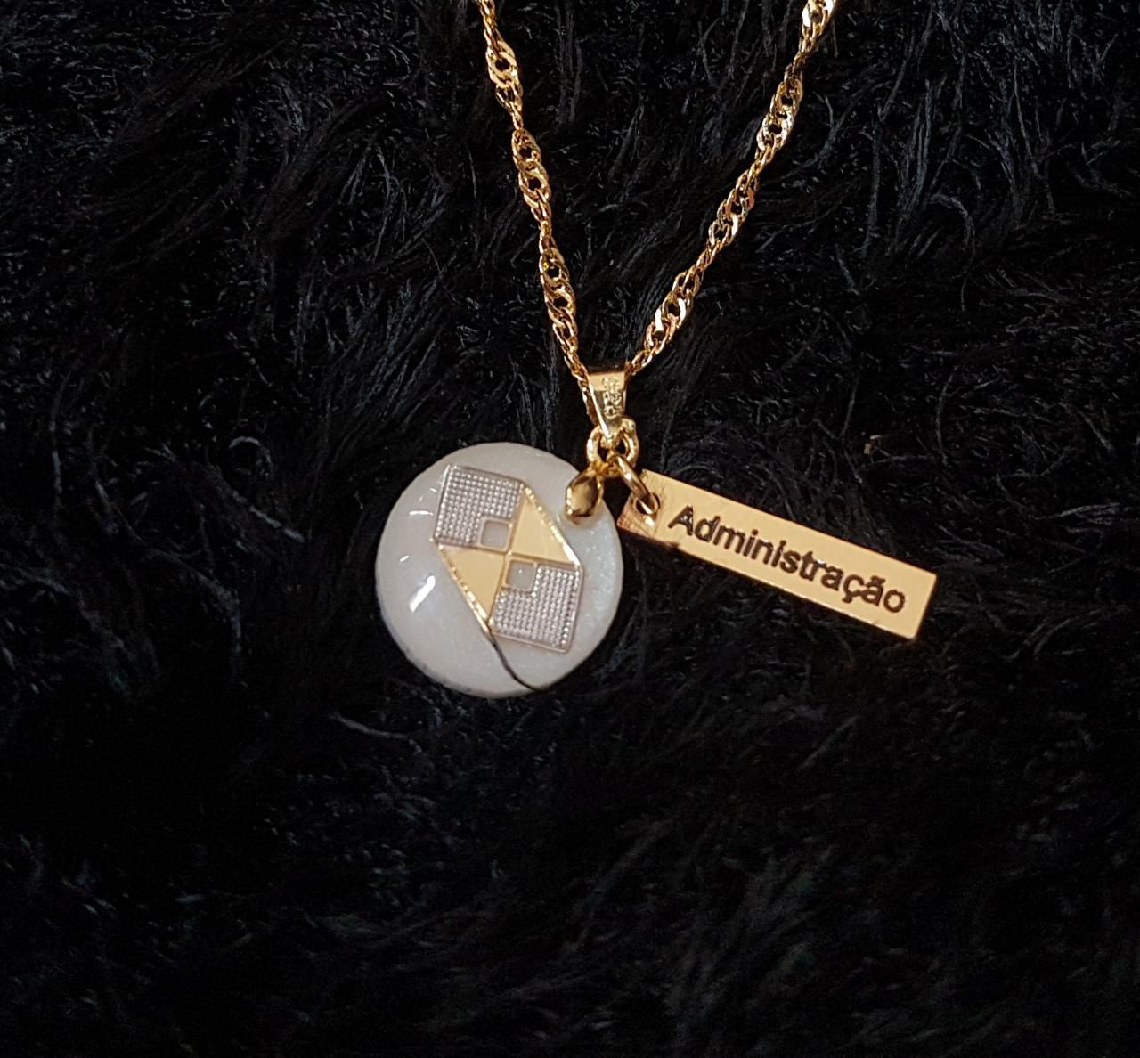 Uma semi jóia maravilhosa ! Folheado a ouro com banho de 10 milésimos, pingente acrilico, cor perolada com placa de folheado a ouro e simbolo de administração azul.